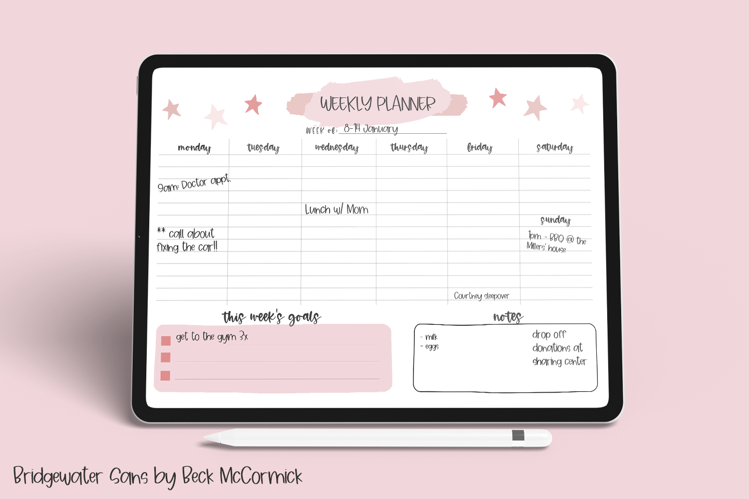 Introducing Bridgewater, an adorable handwritten sans font. Bridgewater is neat & tidy, and would be best for digital planner apps like GoodNotes or using as handwriting practice on an iPad. You can also use it for note-taking apps to make your study notes effortlessly cute, but easy to read. Pawley can also be used for other print design like magazines and flyers or printed marketing materials. This font can also be used for digital marketing materials and social media items!
