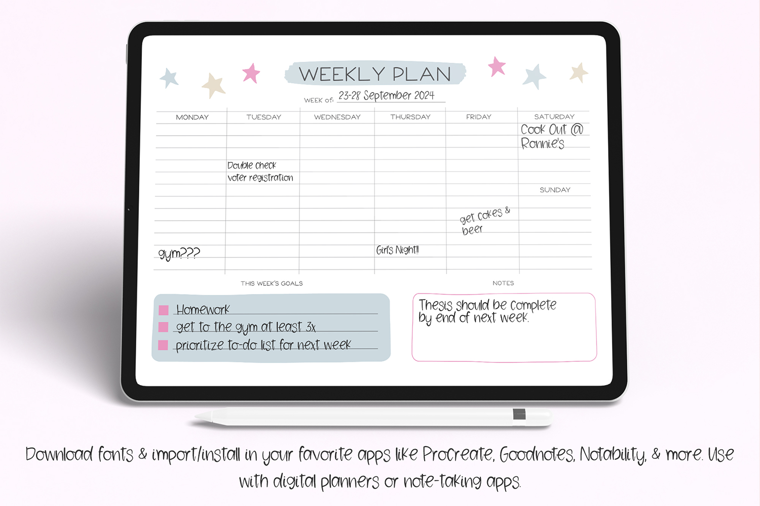 Charming Dear is a neat & tidy hand lettered font with varied stroke thickness. It’s the perfect fit for your digital planner or note-taking app, and is super legible. Charming Dear will be a great fit for your cute home decor projects, your Cricut or Silhouette machine, or logo & branding projects, as well as social media or marketing graphics.