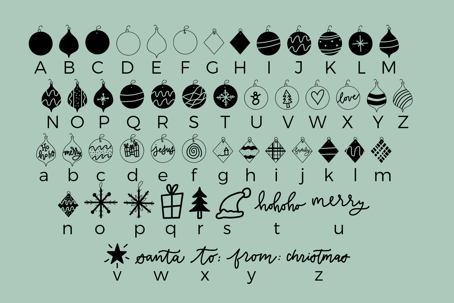 Say hello to Christmas Doodles, a festive holiday font that includes doodles such as ornaments, snowflakes, and Christmas catchwords. Install this font on your computer, and watch as these cute little doodles pop up when you type on your keyboard. Make sure to check the last product image for a full look at the doodles this font includes. This font does not include any letters, numbers, or punctuation.