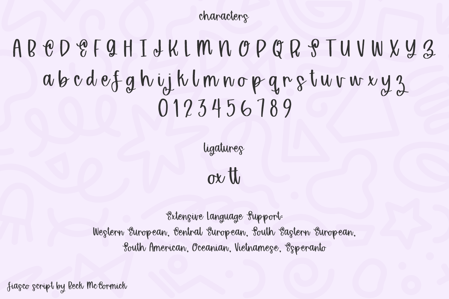 Some fonts include OpenType features, best accessed through programs that support OpenType features like Adobe Photoshop or Adobe Illustrator — you can access them through the Glyphs panel! Ligatures, swashes, and other special characters may also be accessed through Character Map or FontBook and copy/pasted. It is highly recommended that you understand what you are purchasing before you do so — the extra characters WILL take some hunting down if you don’t have easy-access software like Adobe products.