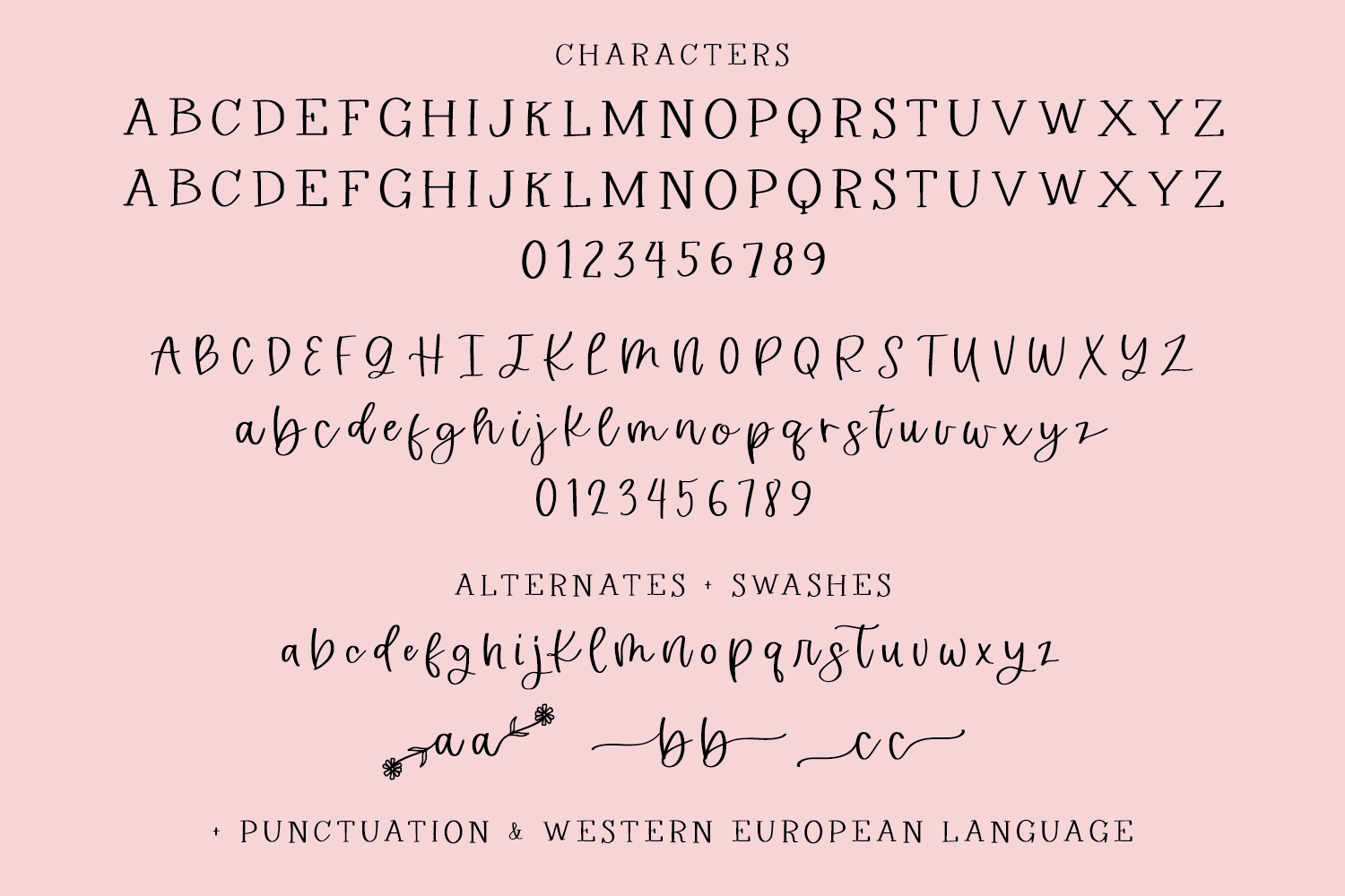 Some fonts include OpenType features, best accessed through programs that support OpenType features like Adobe Photoshop or Adobe Illustrator — you can access them through the Glyphs panel! Ligatures, swashes, and other special characters may also be accessed through Character Map or FontBook and copy/pasted. It is highly recommended that you understand what you are purchasing before you do so — the extra characters WILL take some hunting down if you don’t have easy-access software like Adobe products.