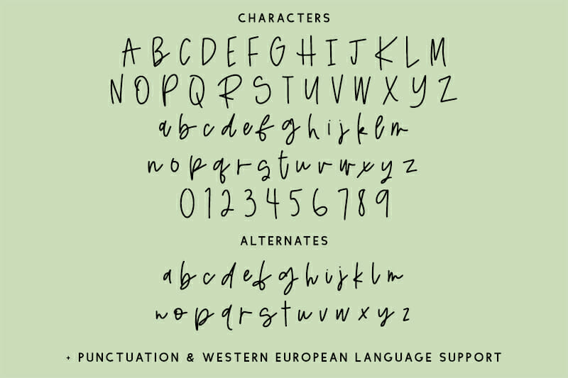 Font files include .otf, .ttf, and webfonts. Some fonts include OpenType features, best accessed through programs that support OpenType features like Adobe Photoshop or Adobe Illustrator — you can access them through the Glyphs panel! Ligatures, swashes, and other special characters may also be accessed through Character Map or FontBook and copy/pasted. It is highly recommended that you understand what you are purchasing before you do so — the extra characters WILL take some hunting down if you don’t have easy-access software like Adobe products.