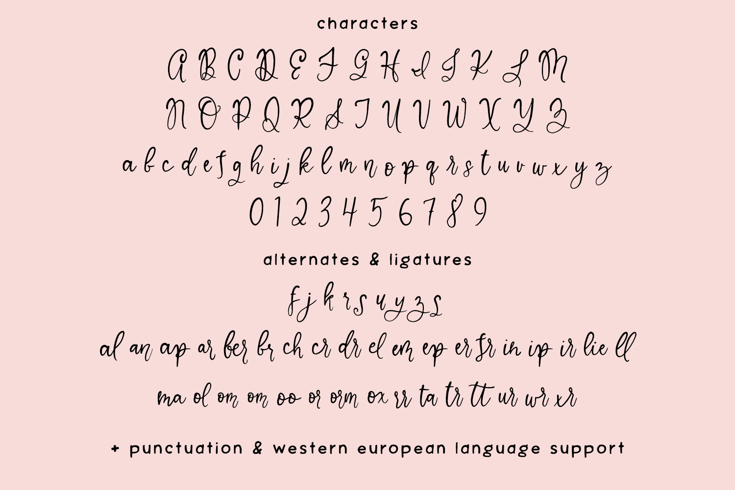 Some fonts include OpenType features, best accessed through programs that support OpenType features like Adobe Photoshop or Adobe Illustrator — you can access them through the Glyphs panel! Ligatures, swashes, and other special characters may also be accessed through Character Map or FontBook and copy/pasted. It is highly recommended that you understand what you are purchasing before you do so — the extra characters WILL take some hunting down if you don’t have easy-access software like Adobe products.