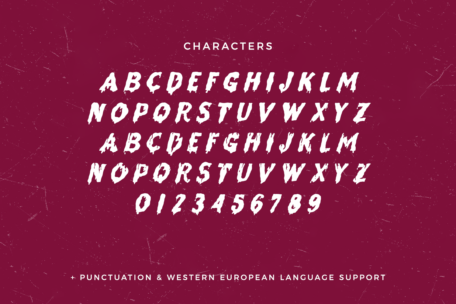 – full upper + lowercase characters (Sanguine is all-caps, but lowercase characters feature “internal bleeding” from the top of the letter creating negative space.)
