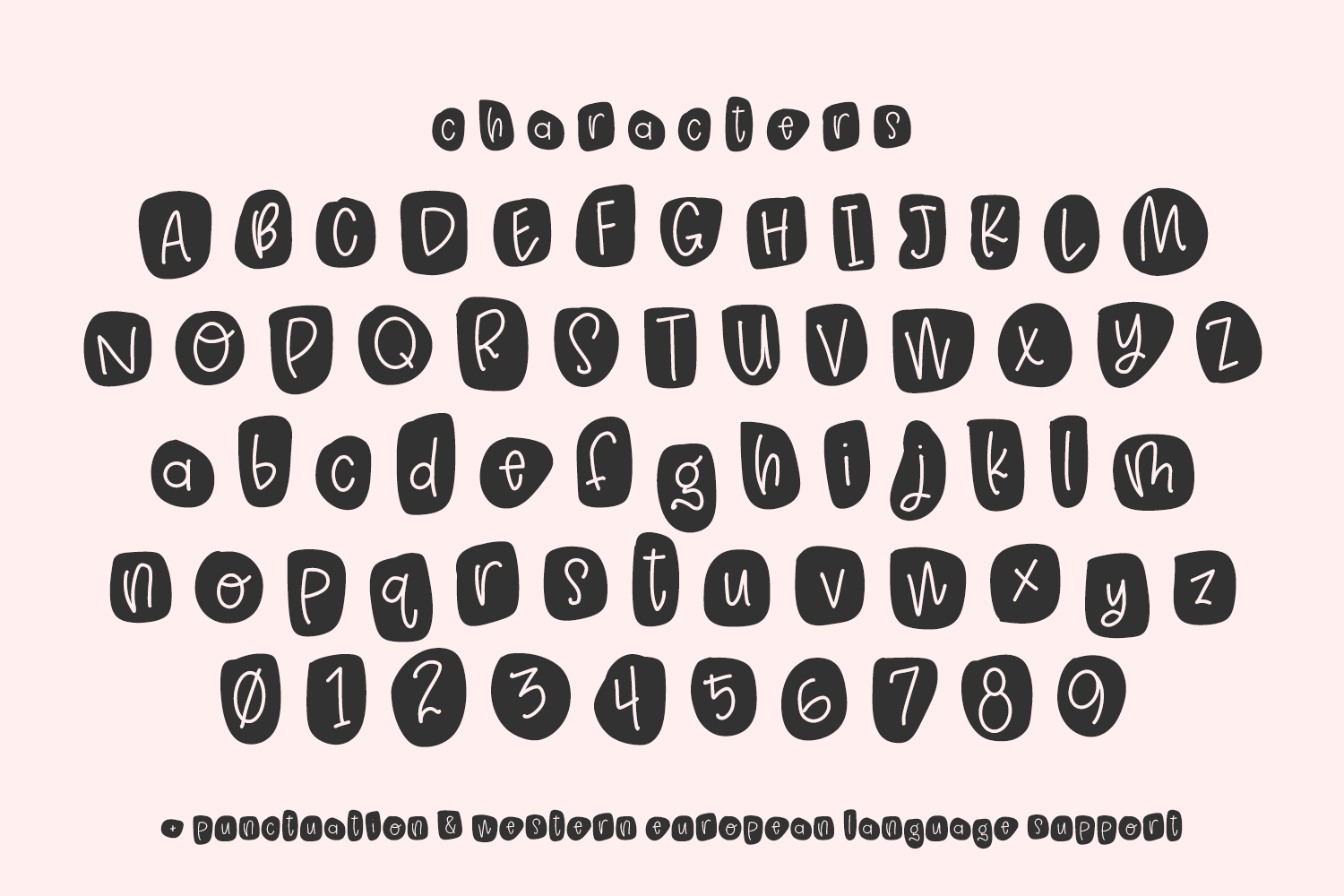 Introducing Stepping Stones, a playful sans font. Each character is enclosed in its own unique shape. Stepping Stones would be a great fit for whimsical crafting projects, shirt design, & more.