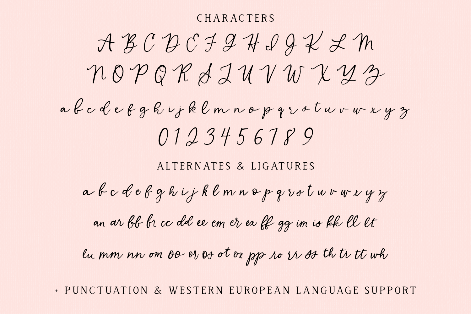Some fonts include OpenType features, best accessed through programs that support OpenType features like Adobe Photoshop or Adobe Illustrator — you can access them through the Glyphs panel! Ligatures, swashes, and other special characters may also be accessed through Character Map or FontBook and copy/pasted. It is highly recommended that you understand what you are purchasing before you do so — the extra characters WILL take some hunting down if you don’t have easy-access software like Adobe products.