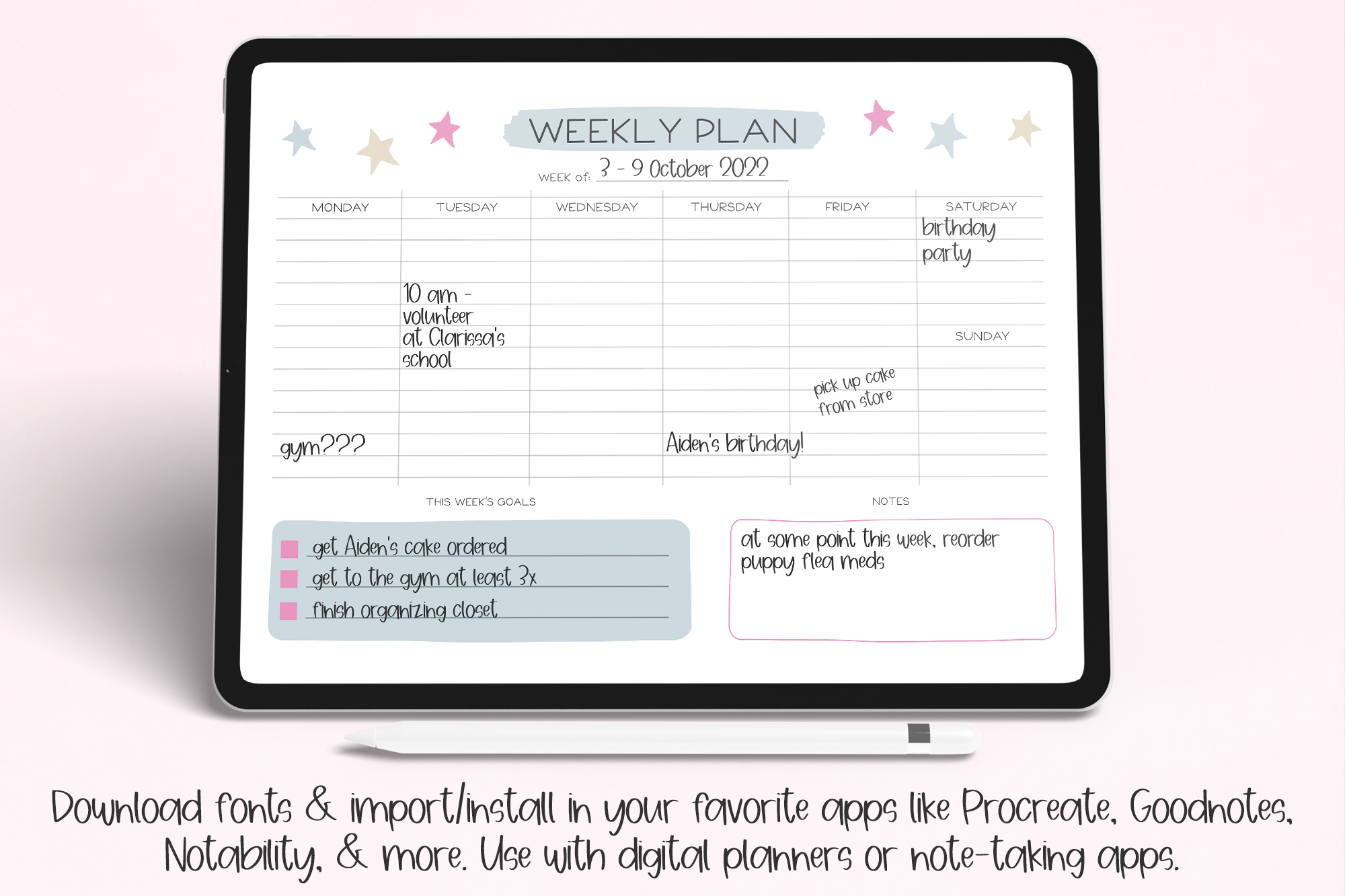 Some suggested uses are: – use with your favorite planner app (GoodNotes, Notability, or Procreate) to make some super cute weekly & monthly planners – use as guidelines for handwriting practice – perfect for teachers that are teaching penmanship, or for the casual learner – use to jazz up your note-taking for your latest classes in school – kept things totally legible but cute, making it even more fun to study – use to create printable designs or digital designs that you can sell, since commercial use is included! – use to create cute flyers, posters, or classroom elements for bulletin boards, name tags, & more Use as Cricut fonts, Procreate fonts, Illustrator or Photoshop fonts, or even with your Canva Pro account. You can use my fonts with Design Space, Silhouette Studio, Procreate, Affinity, Glowforge, GoodNotes, and more! These fonts are all handlettered to perfection, and easy to install! Font file types provided are .otf, .ttf, and webfont (.eot, .woff, and .woff2) files. All fonts include full character sets, numbers, punctuation, PUA encoding, and Western European Language Support.