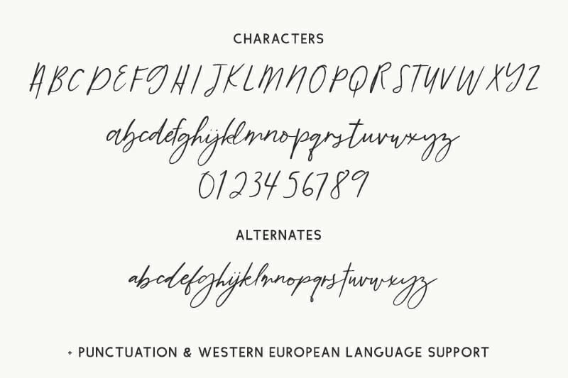 Your Tumbleweed Script Font purchase includes .otf, .ttf, and webfonts. Some fonts include OpenType features, best accessed through programs that support them. Like Adobe Photoshop or Adobe Illustrator — you can access them through the Glyphs panel! Also access ligatures, swashes, and other special characters through Character Map or FontBook and copy/pasted. Please understand what you are purchasing before you do so. The extra characters WILL take some hunting down if you don’t have easy-access software like Adobe products.